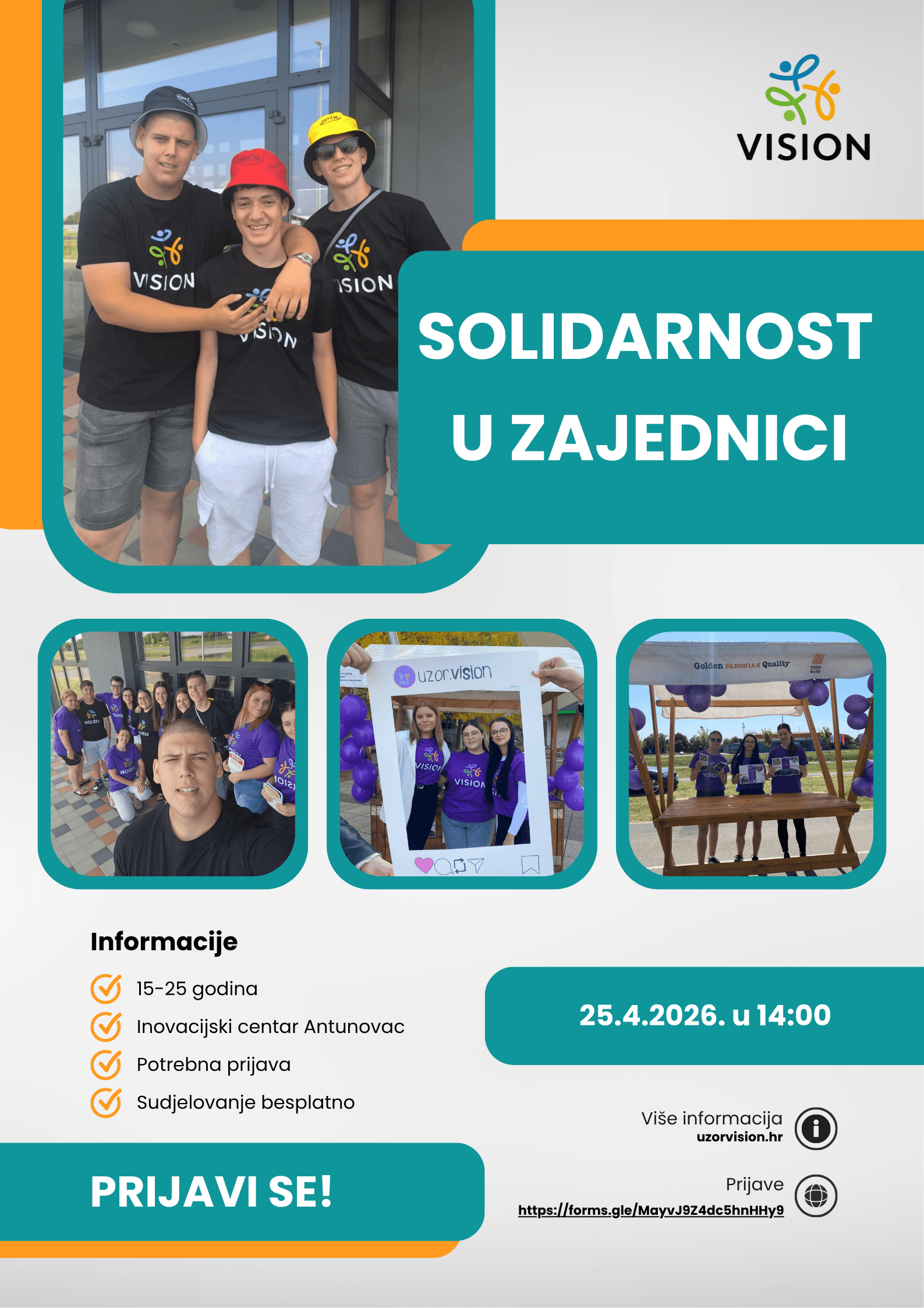 Udruga UZOR Vision u sklopu obilježavanja Europskog tjedna mladih 2026 organizira interaktivnu radionicu namijenjenu mladima koji žele aktivno sudjelovati u razvoju svoje zajednice. Radionica pod nazivom „Od riječi do djela: Solidarnost u našoj zajednici“ održat će se 25. travnja 2026. godine s početkom u 14:00 sati u Inovacijskom centru Antunovac.