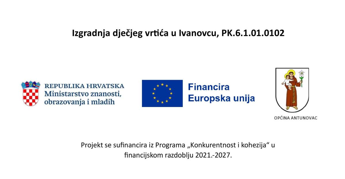 Kratak opis projekta: Projekt Izgradnja dječjeg vrtića u Ivanovcu provodi se na području Općine Antunovac, u naselju Ivanovac, a obuhvaća izgradnju i opremanje vrtića s 3 dnevna boravka, od čega 1 dnevni boravak za jasličku skupinu te 2 dnevna boravka za vrtićku skupinu. Izgradnjom vrtića omogućit će se dodatni kapacitet od 52 mjesta za djecu vrtićke dobi na području Općine Antunovac što će omogućiti roditeljima postizanje ravnoteže između privatnog i poslovnog života te ujedno pridonijeti podizanju životnog standarda i kvalitete života u lokalnoj zajednici.